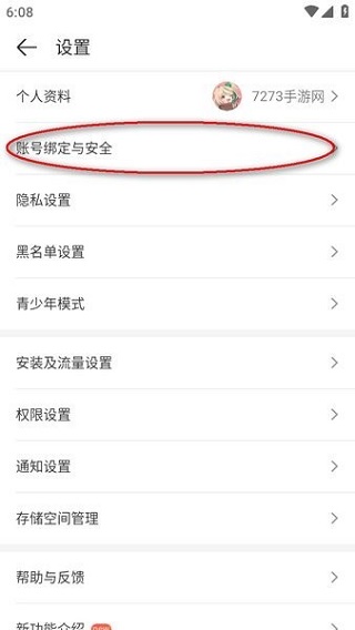 2、在设置菜单中找到并选择“账号绑定与安全”这一功能选项。