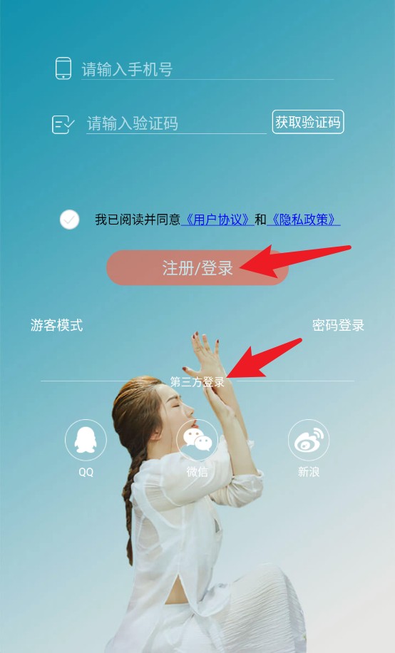 1、打开应用后输入手机号与验证码,勾选协议条款后点击“注册/登录”进入系统界面;