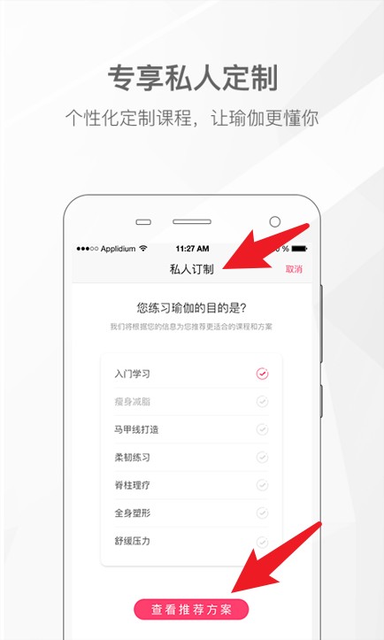 5、私人订制功能可根据用户锻炼目标生成专属计划,点击下方按钮获取推荐方案。