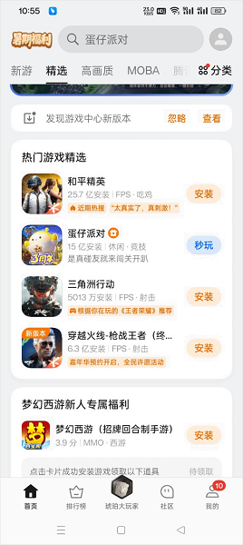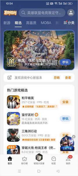 2、平台内汇聚了《和平精英》《蛋仔派对》《三角洲行动》等热门游戏,并提供高画质专区、新游尝鲜、MOBA分类等多个精选栏目供您探索。
