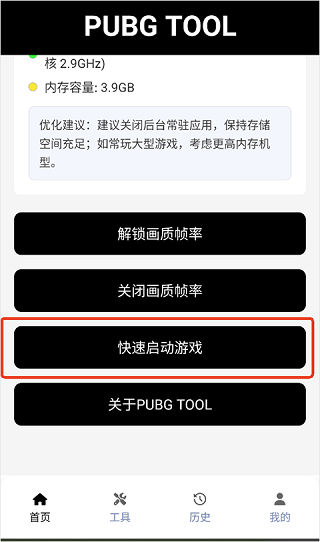 1、下载并启动pubg画质助手,该工具支持解锁游戏画质帧率、关闭相关限制以及快速启动游戏等功能。