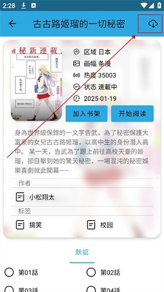 1、打开平台后,浏览并找到你感兴趣的漫画,进入其作品详情页,然后点击右上角的下载图标。