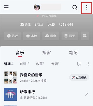 1、魔音音乐App支持导入网易云歌单,需先下载网易云App。打开网易云后进入个人主页,点击右上角菜单图标。