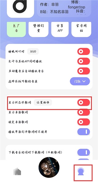 1、打开魔音音乐App,点击底部导航栏最右侧图标,向下滑动并点击【显示状态栏歌词】。
