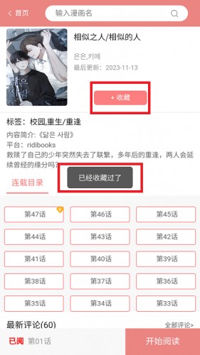 7、找到漫画后进入详情页,点击上方的【收藏】按钮,即可将漫画加入收藏,方便日后随时阅读。