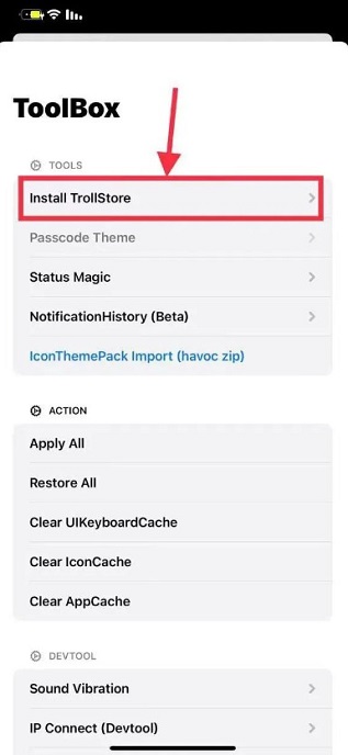 三、在弹出的选项中,选择“Install TrollStore”并点击。