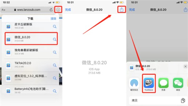 3、下载完成后,找到已保存的文件,长按并选择“共享”功能,再选择“用TrollStore打开”。等待跳转至TrollStore后,点击“Install”进行安装(多个版本请按相同方式逐个安装)。