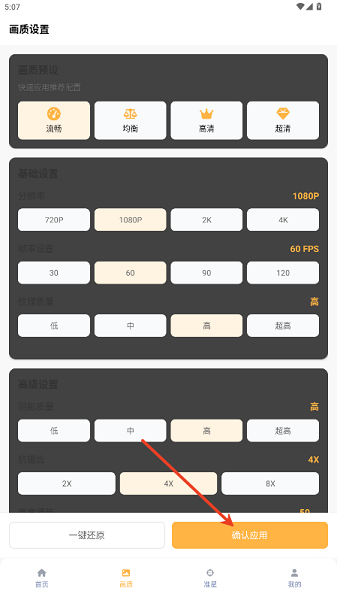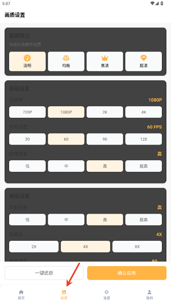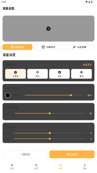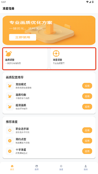 1、进入app后可以看见准星调整和画质调整两大栏。