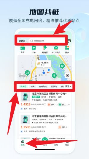 1、在地图找桩页面中,用户可以通过顶部的城市选择和搜索栏输入目标地点,并使用下方筛选标签,如距离、快充、高速路站等,快速查找最适合的充电站位置;