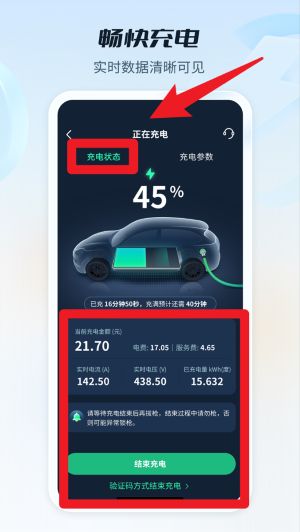 4、在正在充电页面中,系统实时展充电状态的电量百分比、电价、电流电压与已充电量等详细参数,用户可清楚掌握当前充电进度与费用明细。