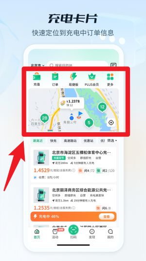 2、充电卡片页面中会自动定位并显示附近充电站的地图分布及实时电价,点击图标可查看详细信息,帮助用户快捷制定充电路线;