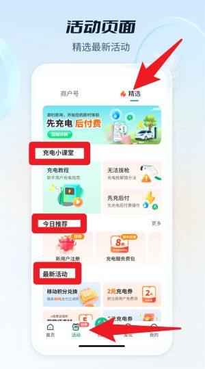 3、活动页面聚合了精选充电活动、充电教程、每日推荐与最新优惠,用户可通过底部导航栏点击“活动”进入,轻松获取平台福利与充电知识;