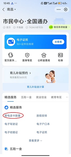 3、在服务列表中找到并点击“查询电话卡数量”选项。