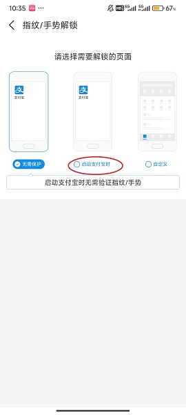 5、在解锁设置中,选择“启动支付宝时”这一项。