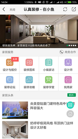 4、有没有在为装修烦恼呢?别担心,认真装修就在小鱼!这里有很多家居服务包括设计与报价、装修攻略和家居头条等诸多内容,帮您打造完美新家;