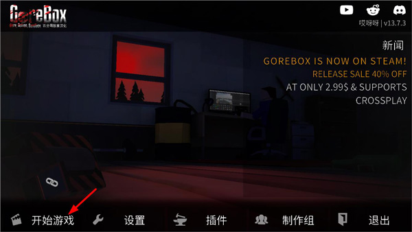 1、玩家在登录游戏后,将进入主界面。在此可以调整游戏设置、浏览插件等功能,随后点击开始游戏按钮进入下一步。