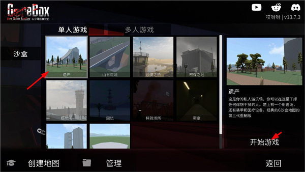 2、游戏主要分为单人模式与多人模式。单人模式中包含多个预设场景,玩家可选择任一场景开始,也可自行创建地图。若选择遗产地图,确认后即可开启游戏。