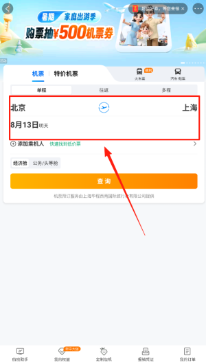 2、选择机票选项,输入出发地和目的地,轻松查找航班信息;
