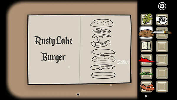 茅草屋桌子上,可以查看锈湖汉堡的食谱,记住食材的摆放顺序,进入天堂岛高塔顶部房间,利用桌子上的面包制作出汉堡。胖男人会吃掉汉堡。