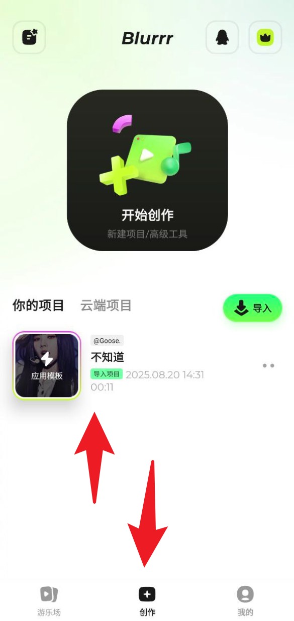 3、切换至底部「创作」页面,在「你的项目」中可查看当前模板项目,点击可进入编辑。