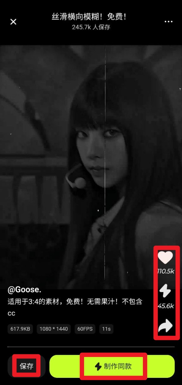 2、在模板详情页点击「制作同款」,可快速创建属于自己的视频项目,也可点击「保存」或点赞、转发模板。