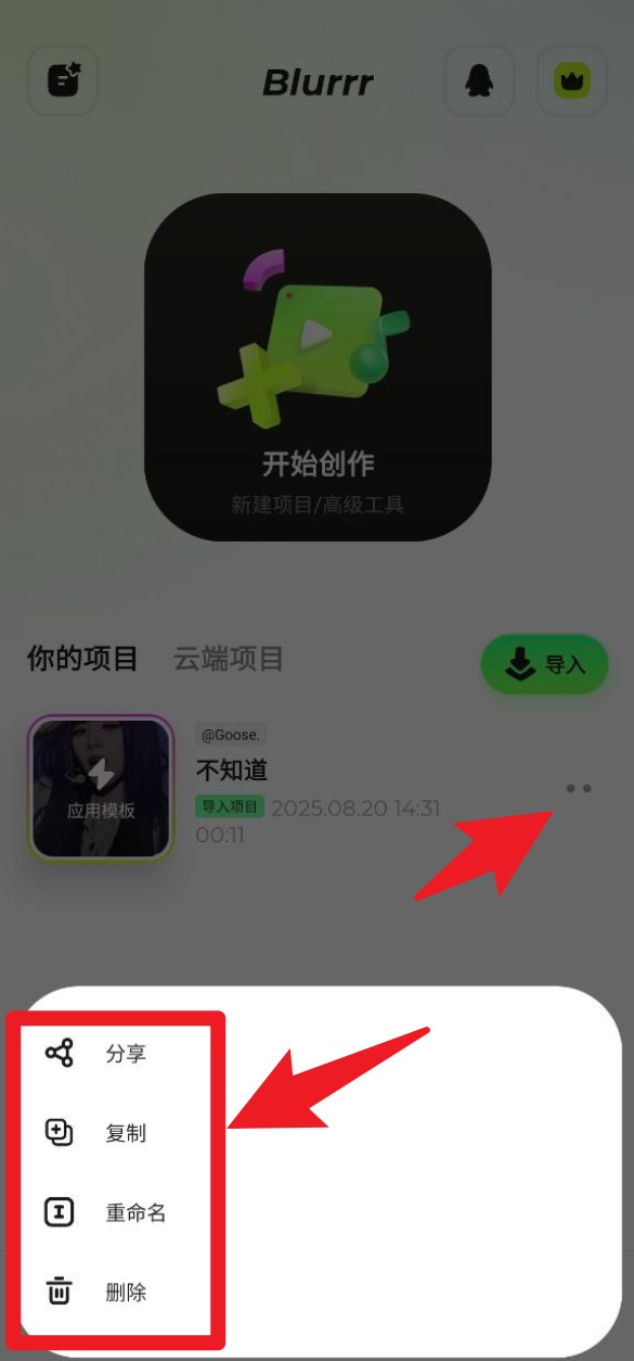 4、点击项目右侧「…」按钮,可进行分享、复制、重命名或删除等操作。