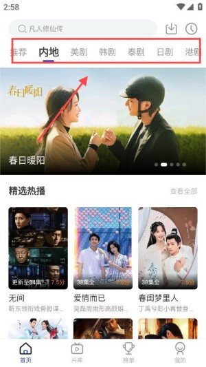 2、在主界面的顶部,您可以看到推荐、中国大陆、美剧等多个类别标签,您可以在其中查看来自中国大陆的热门电视剧。