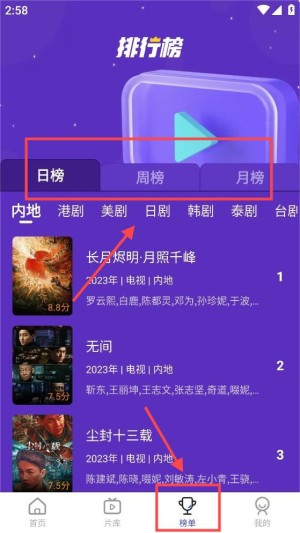 4、在“排名列表”页面,您可以查看不同类别的热门视频排名。点击“日线图”、“周线图”或“月线图”切换查看。