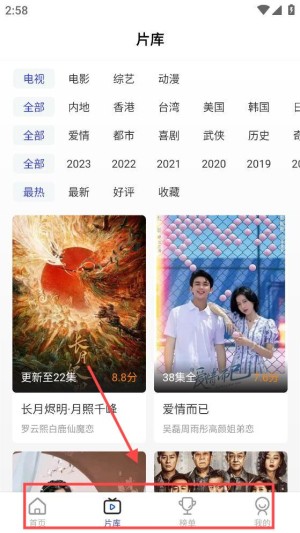 3、点击底部导航栏中的“影片库”图标,进入影片库页面。在这里,您可以根据类型、地区、年份等条件过滤视频内容。