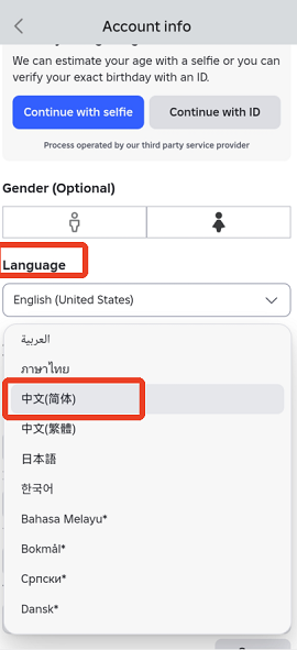 4、在账户信息中向下查找【语言】设置项,点击后选择“简体中文”。