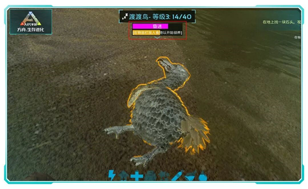 9、接下来进入等待阶段,需不断补充食物与黑色果实。驯服条满后即可获得恐龙伙伴。此过程较为漫长,且可能出现其他生物袭击,请注意保护正在驯服的恐龙。
