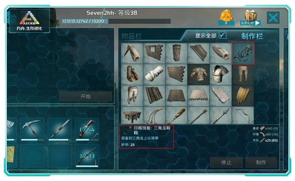 10、若想骑乘恐龙(部分恐龙无法骑乘),需先制作对应的鞍具。鞍具图纸需消耗技能点在技能栏中解锁,且不同恐龙所需鞍具不同,这也意味着需达到相应等级才可骑乘特定恐龙。