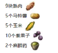 制作配方:9块熟肉、5个马铃薯、5个玉米、10个紫果子、2个麻醉药。
