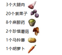制作配方:3个大腿肉、20个紫果子、8个麻醉药、、2个珍惜蘑菇、1个马铃薯、1个胡萝卜。