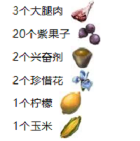 制作配方:3个大腿肉、20个紫果子、2个兴奋剂、2个珍惜花、1个柠檬、1个玉米。