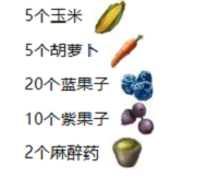 制作配方:5个玉米、5个胡萝卜、20个蓝果子、10个紫果子、2个麻醉药。