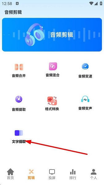 2、在音频剪辑页中选择“文字提取”选项,进入音频文件选择页面。