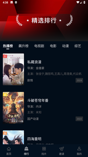 2、进入“排行”栏目,即可浏览各类热门排行榜单。