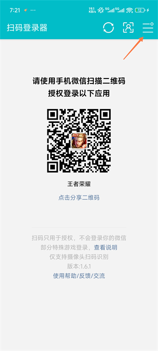 1、打开扫码登录器App,点击右上角的【三】图标。