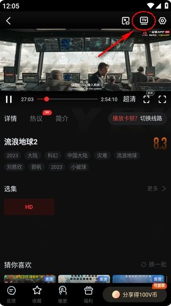 3、播放您想观看的视频,点击画面右上角的“TV”图标。