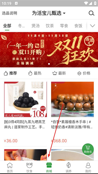 3、点击商城选项进入商城页面浏览黑芝麻丸、素履檀香木手串等养生产品,可根据需求选择购买。