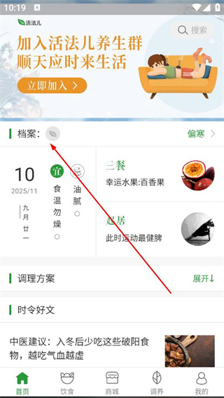1、进入APP首页查看档案信息了解自身体质偏寒情况,浏览三餐、起居等养生建议,也可点击加入养生群,获取更多养生知识。