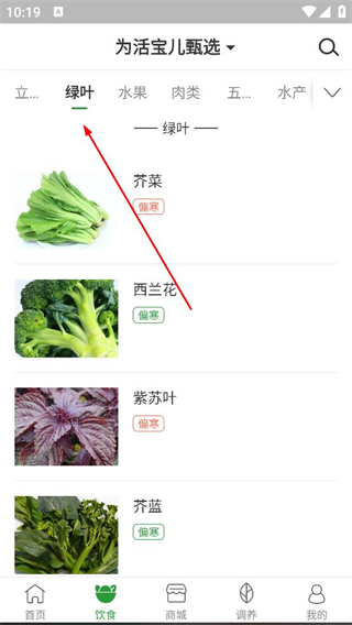 2、点击饮食选项进入饮食页面选择绿叶类食材,查看芥菜、西兰花等食材的寒热属性,为饮食选择提供参考。