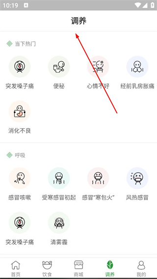 4、点击调养选项进入调养页面查看突发嗓子痛、便秘等热门调养分类,选择对应的调养方法,进行身体调理。