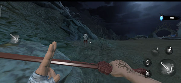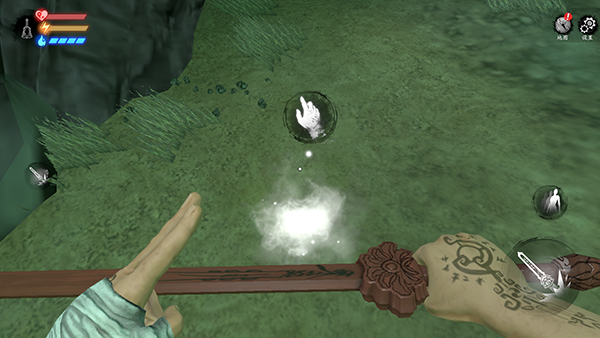 这里有三个小怪比较好打,小怪在发现自己时会有一段空闲时间,在这段时间内使用桃木剑进行攻击,如果没打死 边打边退,看到小怪抬手攻击时闪避即可。