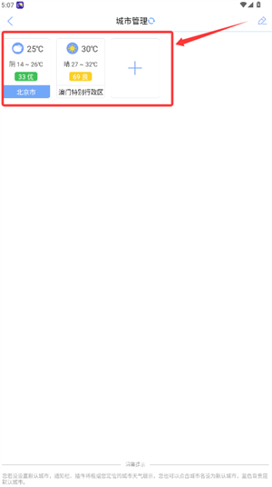 1、进入软件城市管理页,点击加号添加需关注天气的城市名称;
