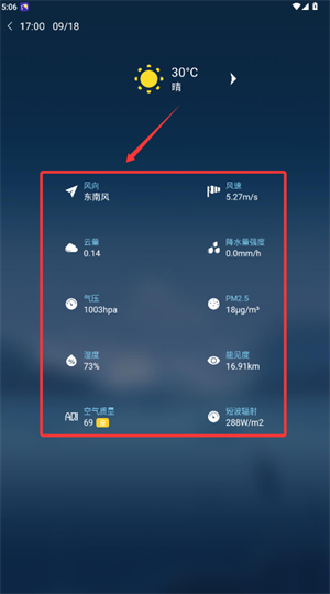 2、选择已添加城市后,可查看实时风向、风速及云量等气象数据;