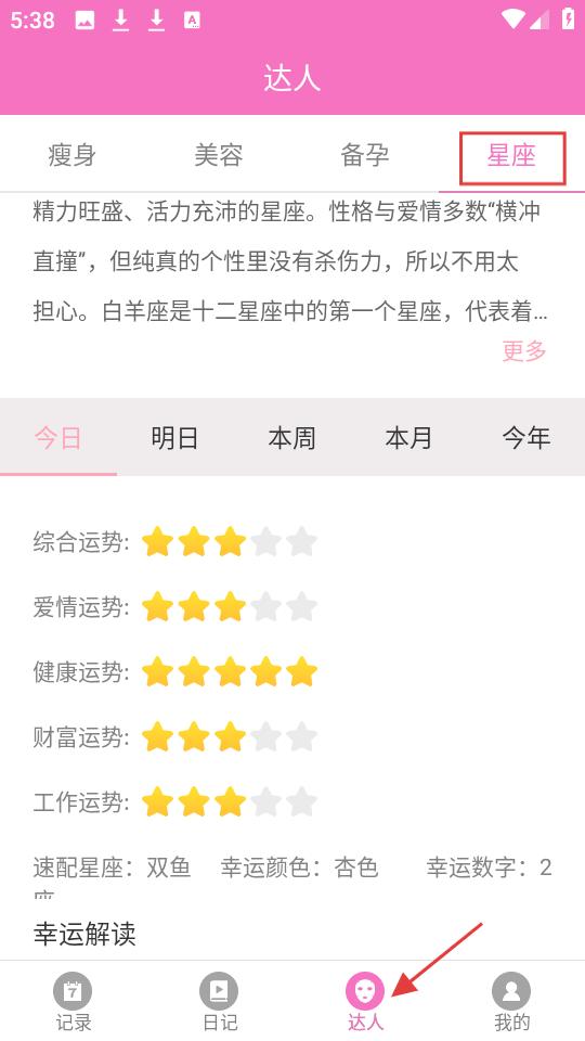 2、点击达人星座页面,解析白羊座性格,呈现今日综合、爱情、健康等运势,含速配星座等信息;