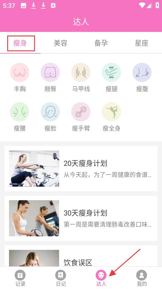1、点击达人瘦身界面,设有丰胸、瘦腰等多样瘦身类目,展示20天、30天瘦身计划等实用资讯;
