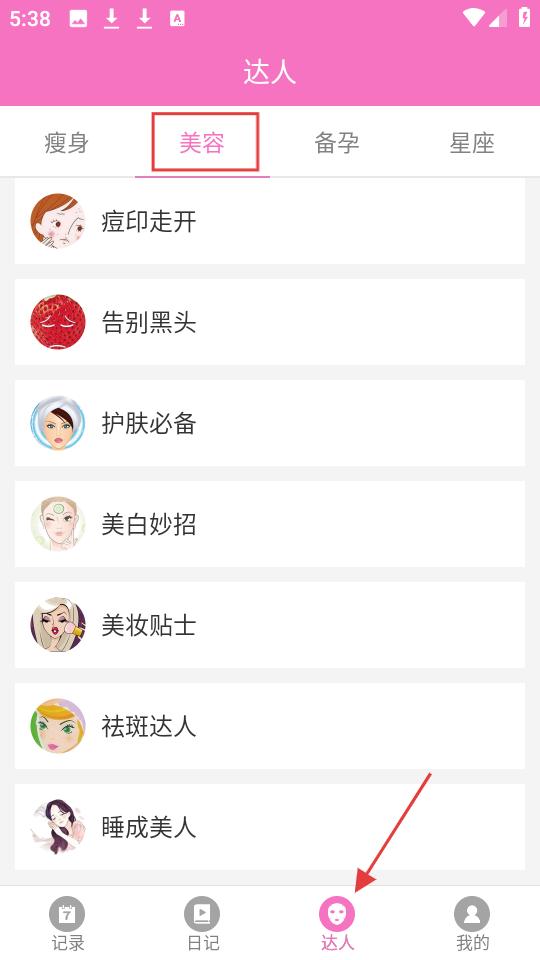 3、点击达人美容板块,汇聚痘印走开、美白妙招等主题,为用户提供丰富的美容护肤相关内容。